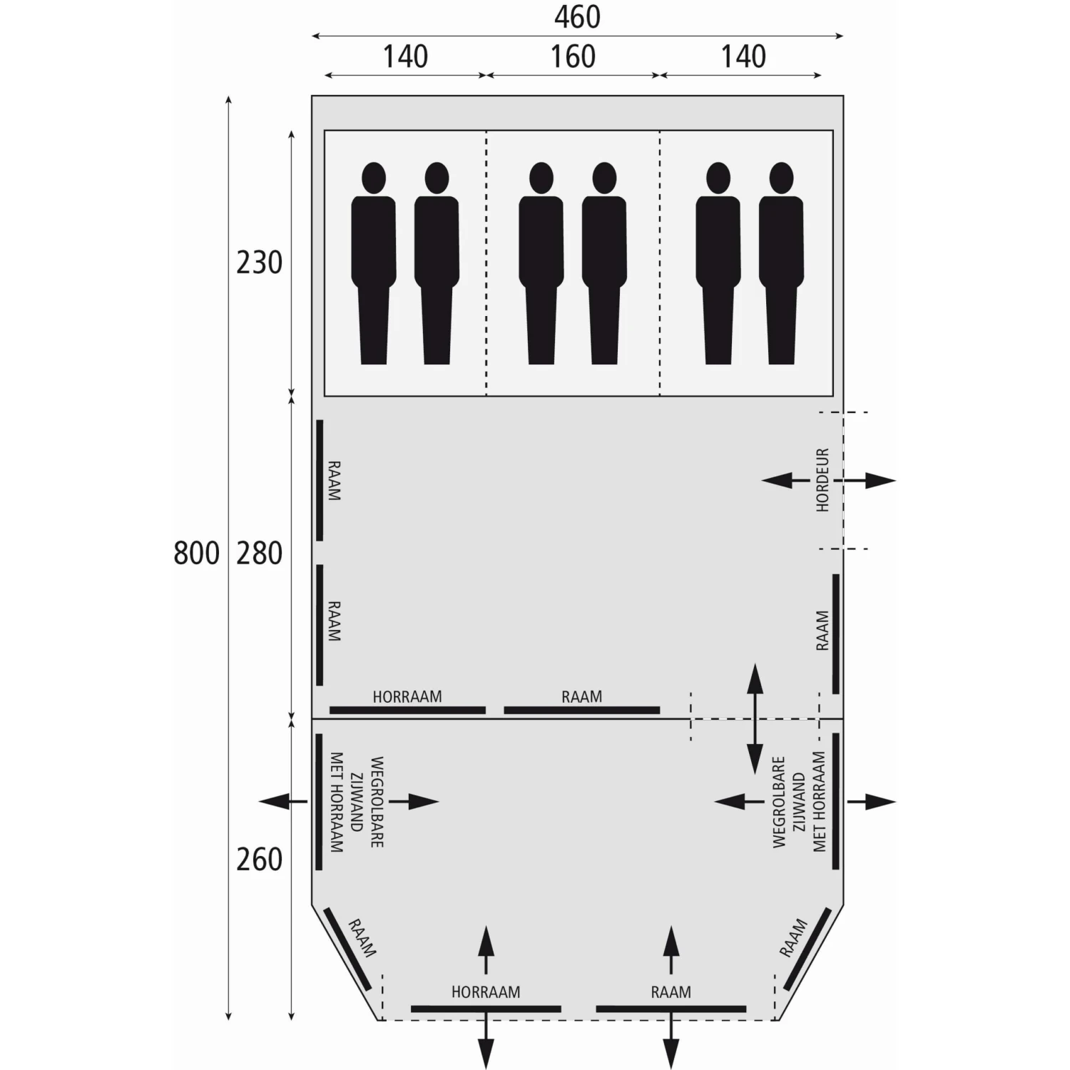 De tunneltent heeft drie slaapcabines. De meest linker en rechter slaapcabines zijn 140 centimeter breed. De middelste slaapruimte is 160 centimeter breed, waar twee mensen kunnen slapen. Alle slaapcabines hebben een lengte van 230 cm. De slaapcabines zijn daarnaast extra donker om het slaapcomfort te verbeteren. De uitritsbare voorwand heeft een extra brede deur waarmee de leefruimte groter gemaakt kan worden. De tent heeft een zij-ingang voorzien van volledige horrengaasdeur. De royale luifel heeft wegrolbare wanden aan de zijkant met horramen die afsluitbaar zijn. De uitritsbare voorwand heeft een extra brede deur om de leefruimte te vergroten.