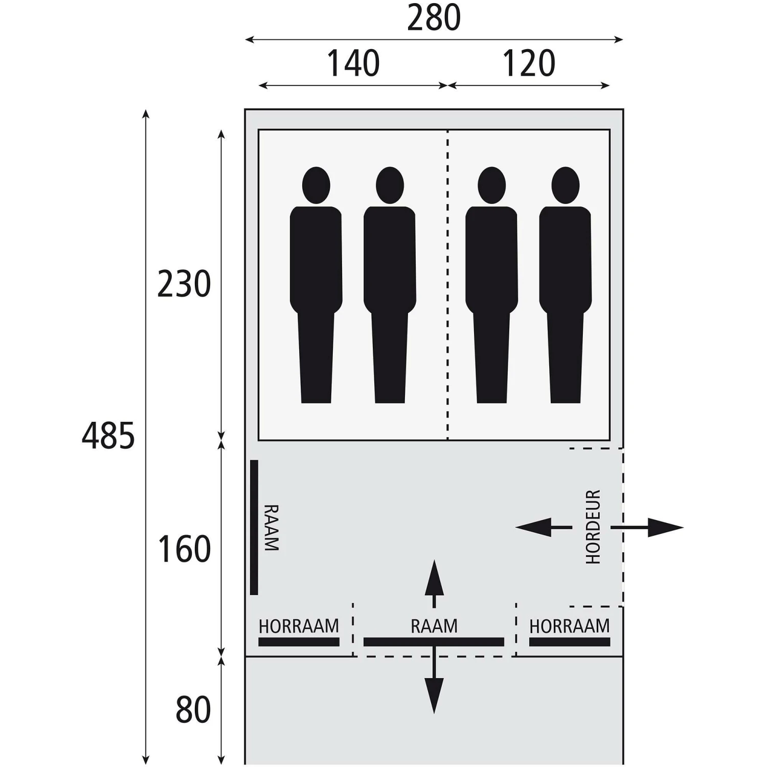 De tunneltent is uitgerust met twee slaapcabines die ieder geschikt zijn voor twee personen. Deze slaapcabines zijn extra donker en hebben een lengte van 230 cm. De wegritsbare scheidingswand zorgt voor een flexibele indeling van deze slaapcabines.