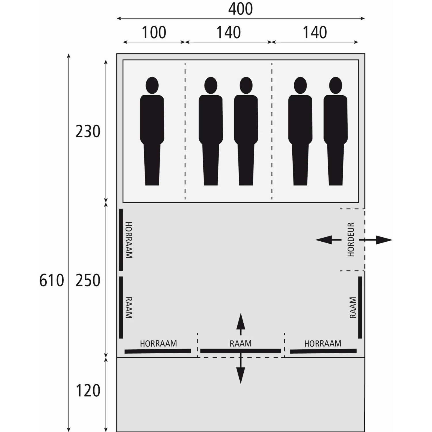 De Spitfire 400 XL RSTC tunneltent van Bardani is een royale familietent met stahoogte en een zij-ingang met een hordeur. De tent is beschikt over drie extra lange en donkere slaapcabines, waar ruimte is voor maximaal 5 personen.