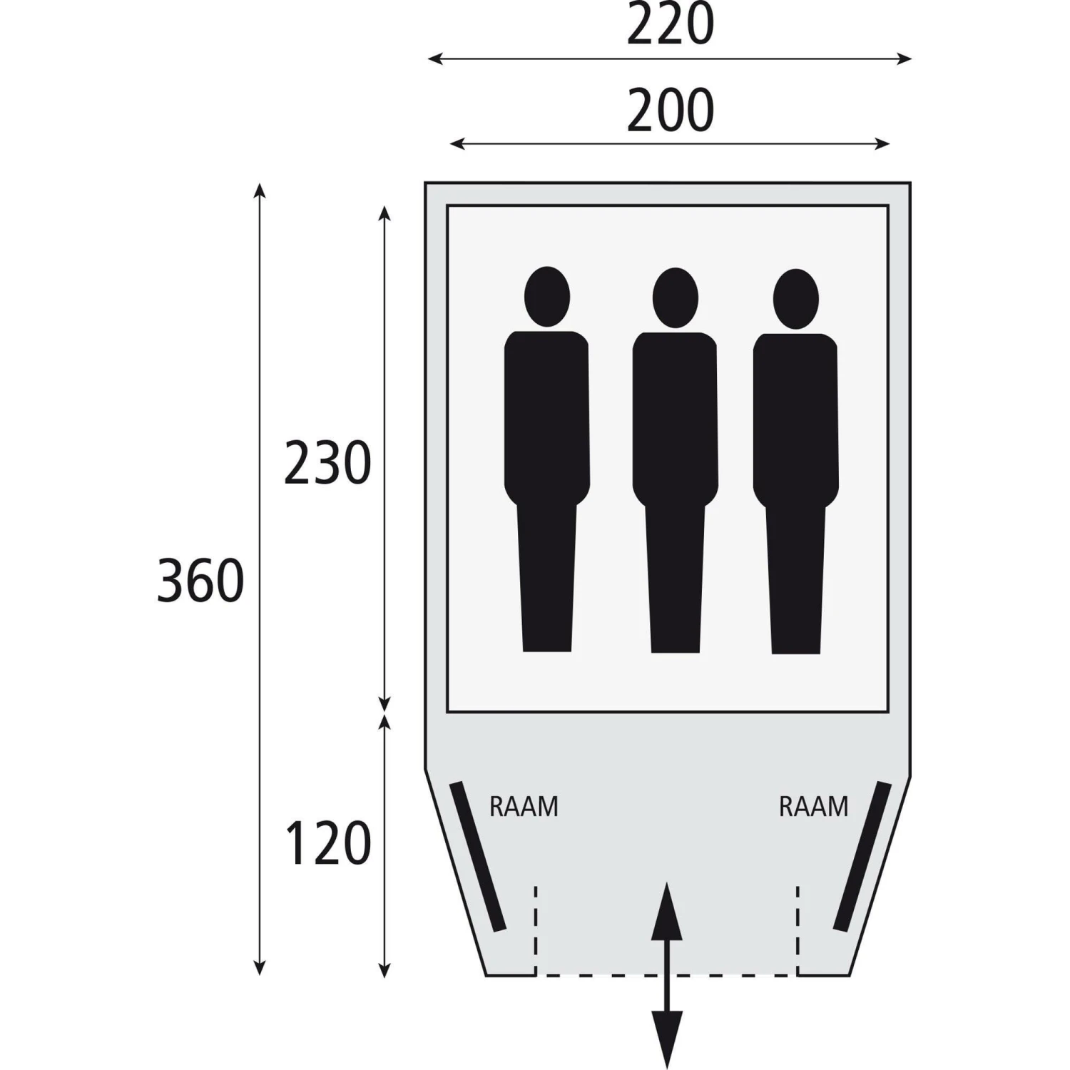 De koepeltent is uitgerust met één slaapcabine. Deze cabine is geschikt voor maximaal drie volwassen personen. Deze slaapcabine is voorzien van een donkere binnentent voor optimaal slaapcomfort. Ook de lengte van 230 cm draagt bij aan dit comfort. De deur is gemaakt van volledig horrengaas en ook de achterzijde is voorzien van horrengaas.