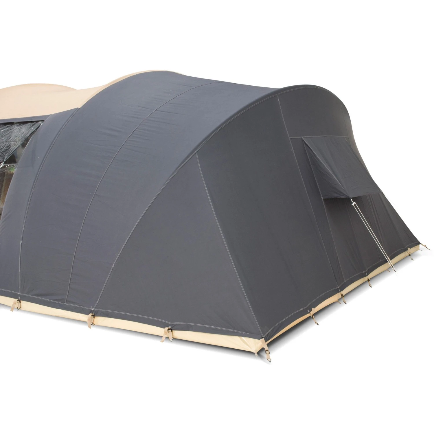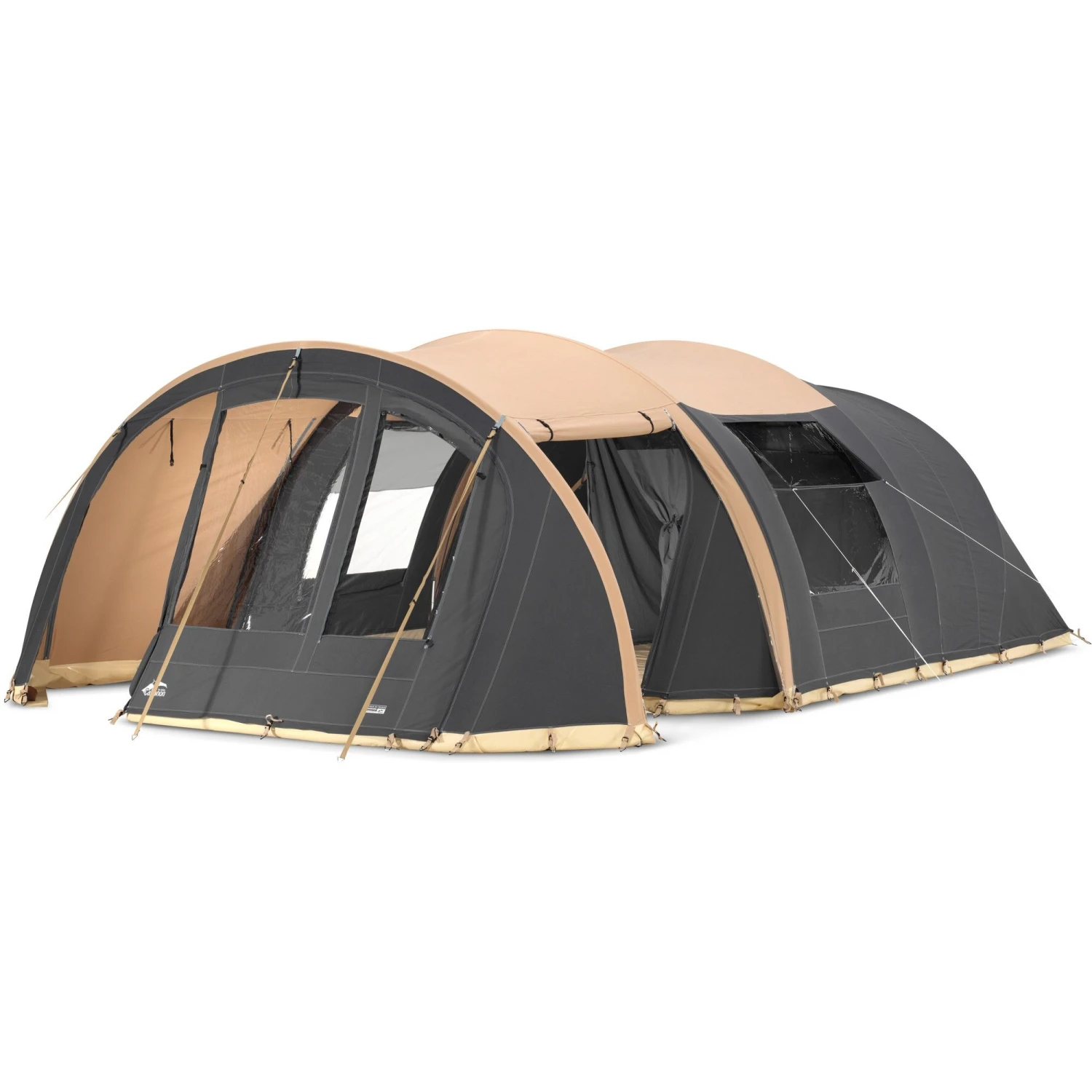 De tent heeft een slaapcabine met King Size formaat waarin een groot luchtbed past. Er is ruimte voor een organizer aan de zijkant van de slaapcabine, die u apart kunt aanschaffen. Deze slaapcabines kunt u opdelen met de oprolbare scheidingswand. De leefruimte heeft een stahoogte van 225 centimeter. De zijwand en grote pvc-ramen hebben horrengaas voor uitmuntende ventilatie en bieden extra veel zicht. De gordijnen met variabel verduistersysteem zijn vanuit de leefruimte te bedienen.