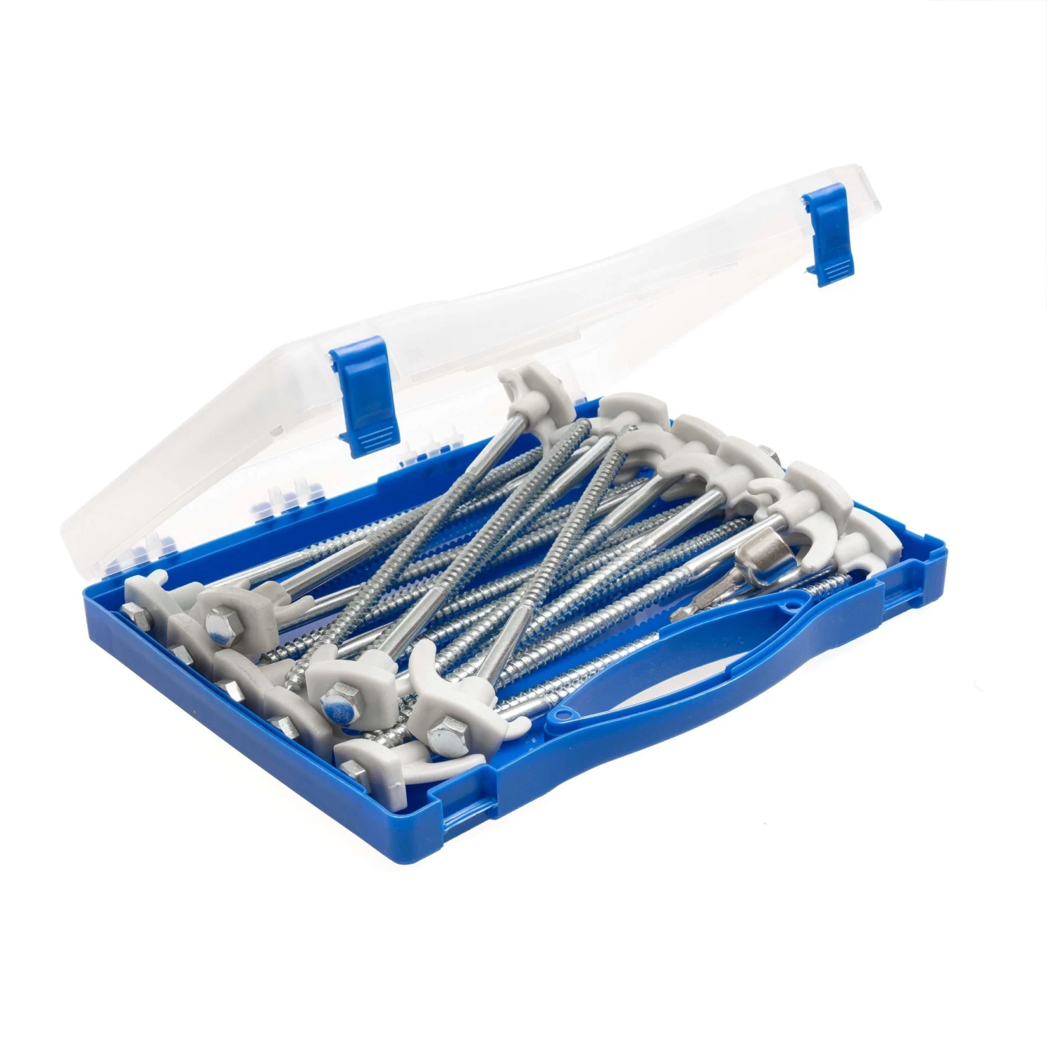 In de Campking Permafrost schroefharing kofferset zitten 18 haringen en een handig hulpstuk voor een boormachine. Deze schroefharingen zijn geschikt voor gebruikt in harde of bevroren ondergronden.