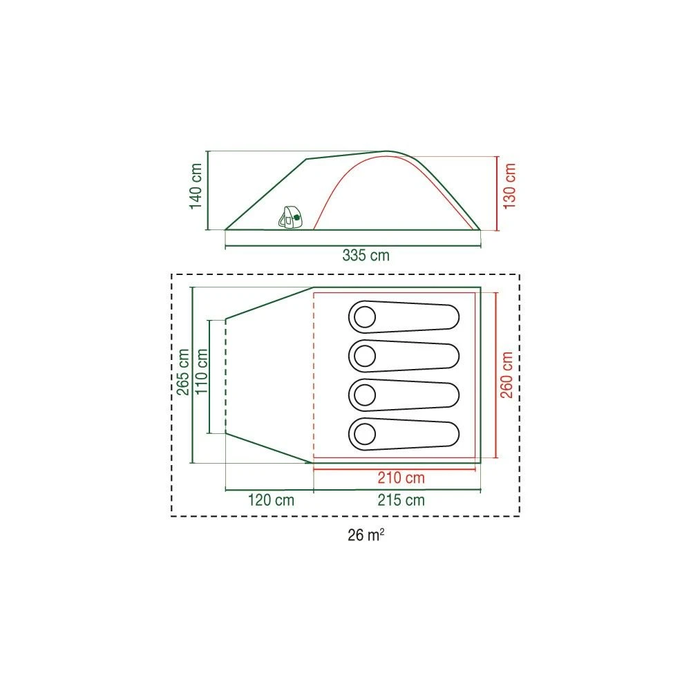 Het buitenmateriaal is gemaakt van stevig polyester met een PU coating en een waterkolom van 4500 millimeter. De tent bestaat uit 2 gedeeltes, een slaapcabine en een ruimte om spullen op te bergen. De 4 persoonsslaapcabine heeft een afmeting van 210 bij 260 centimeter. De andere ruimte is een donkere cabine met een goed ventilerend vermogen.