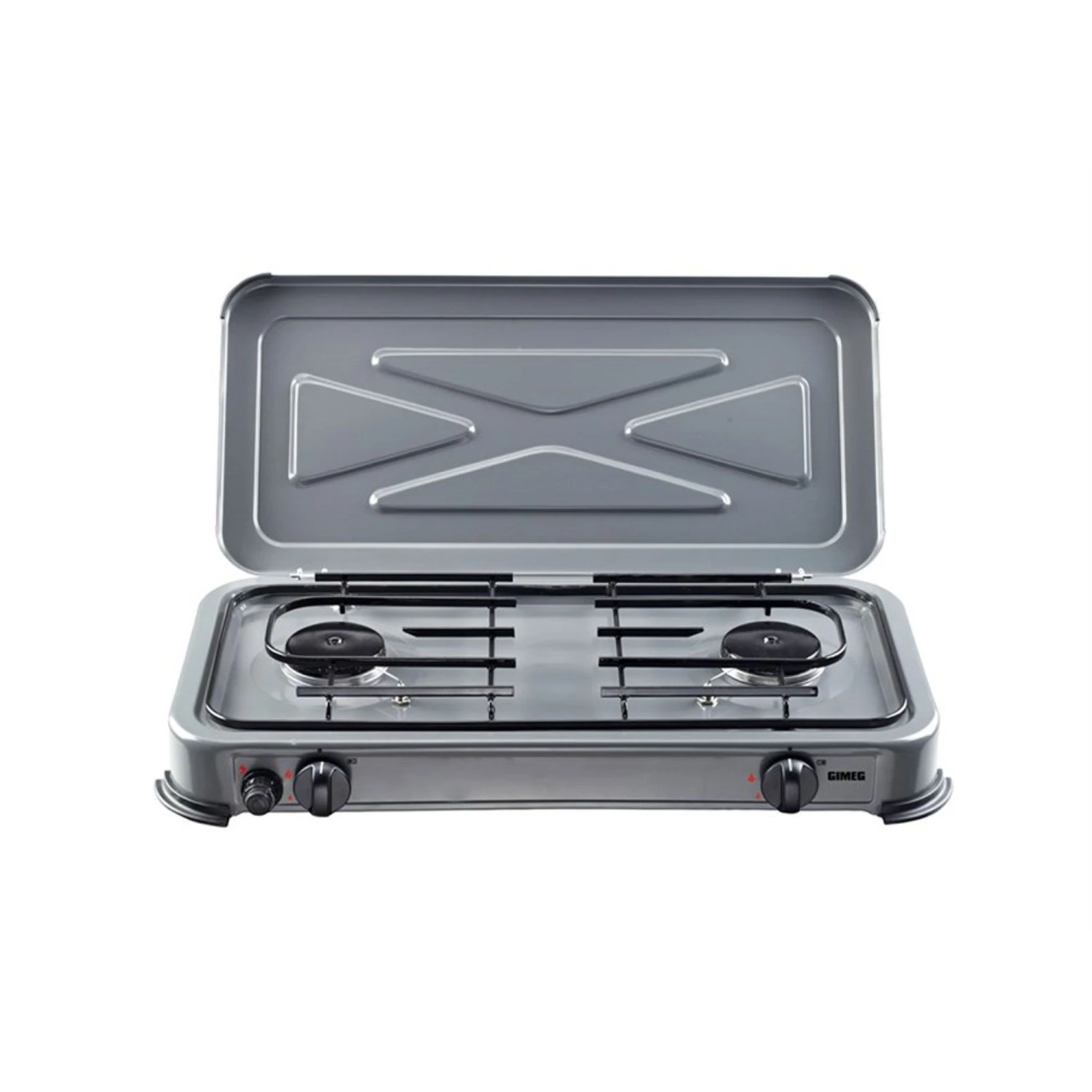 Dit grijze 2-pits kooktoestel van Gimeg heeft 2 krachtige 2,2 kilowatt branders voor een maximaal vermogen. Dankzij de ingebouwde elektrische ontsteking is dit kooktoestel simpel en veilig te ontsteken. Dit product heeft antislip voeten, wat voor extra stabiliteit en veiligheid zorgt. Het kooktoestel beschikt over een deksel om het product na gebruik af te sluiten. Deze kan ook dienen als windscherm voor tijdens het koken. De pannendragers zijn afneembaar en de onderdelen zijn geëmailleerd.