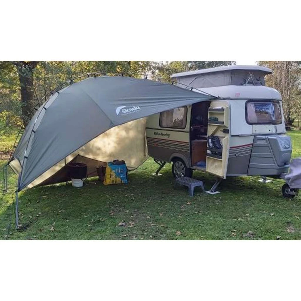 De Femkes RooftopTents Skadu Too luifel met zijwanden creëert extra schaduw en beschutting bij ieder type (kampeer)voertuig. De Skadu luifel kan achter of naast de auto, bus of caravan worden geplaatst. De luifel is voorzien van drie zijwanden, ideaal voor extra privacy. De Skadu luifel kan ook los worden opgezet: bij de luifel zijn vier extra stokken en scheerlijnen inbegrepen. U hoeft alleen nog voor de haringen te zorgen, want alleen u weet waar de reis naartoe gaat!