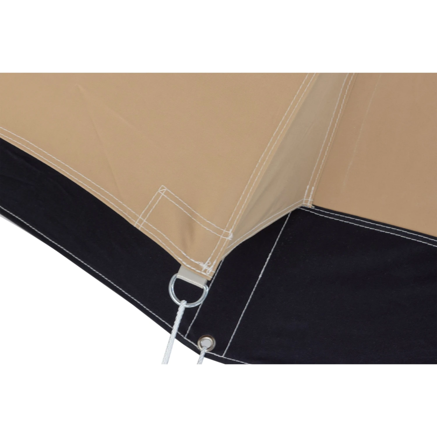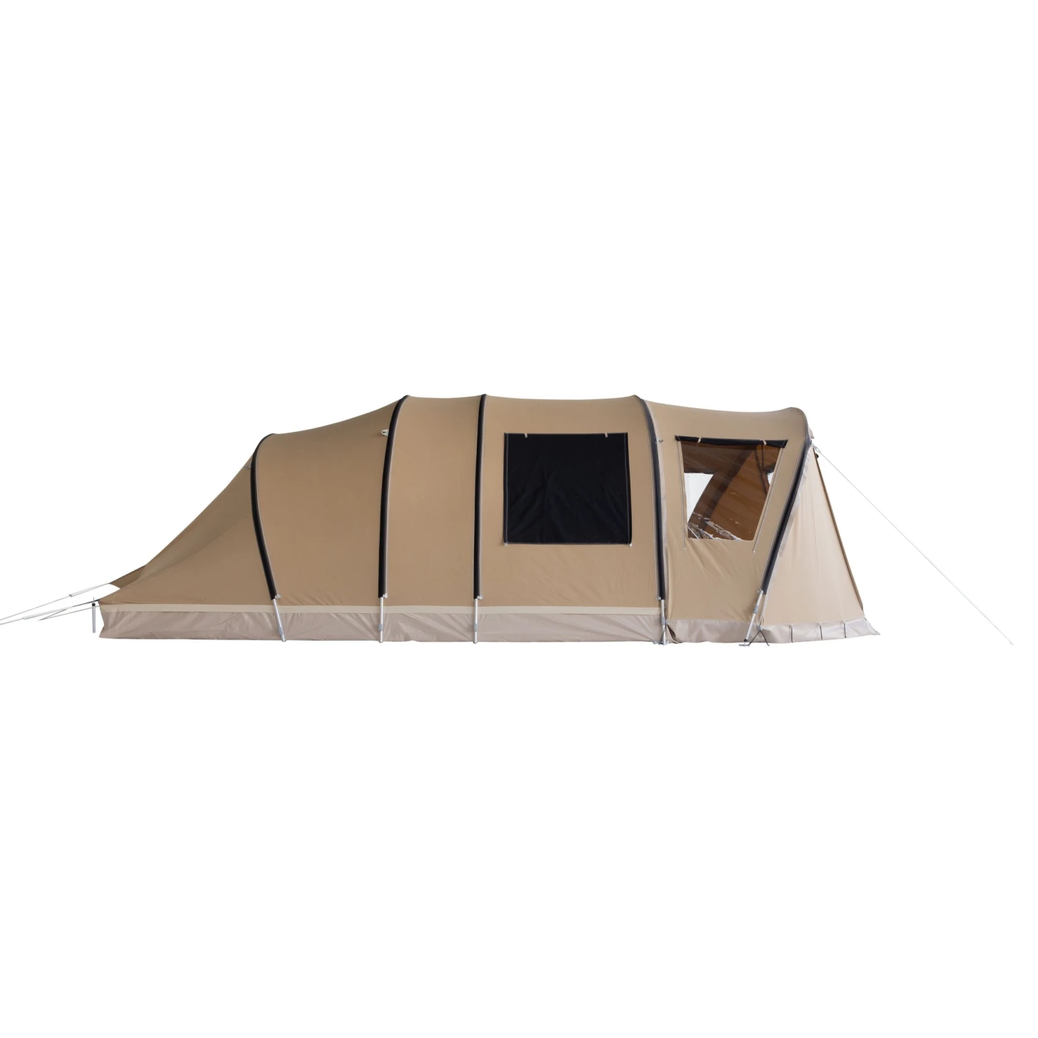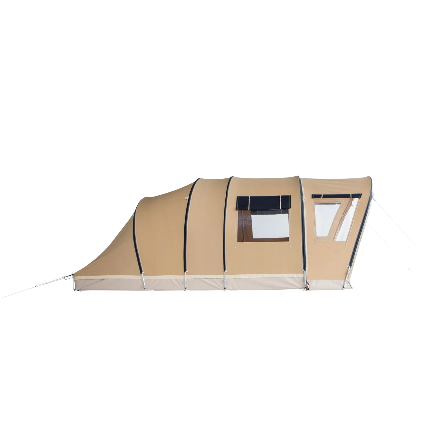 De Lacerta tunneltent is voorzien van een neerklapbaar bisonyl grondzeil. Het grondzeil heeft een hoge rand van 25 centimeter om water, wind en ongedierte buiten te houden. Daarnaast is het zeil naar te klappen bij de entree voor gemakkelijke entree tot de tent. De buitentent is gemaakt van 100% Ten Cate katoen, dit versterkt het ademende vermogen van de tent. Met de grote ramen aan weerszijden en overige ventilatieopties kan de temperatuur in de tent worden afgesteld tot op zekere hoogte. De tent is standaard voorzien van twee gaasramen met raamoverflap aan de voorkant.