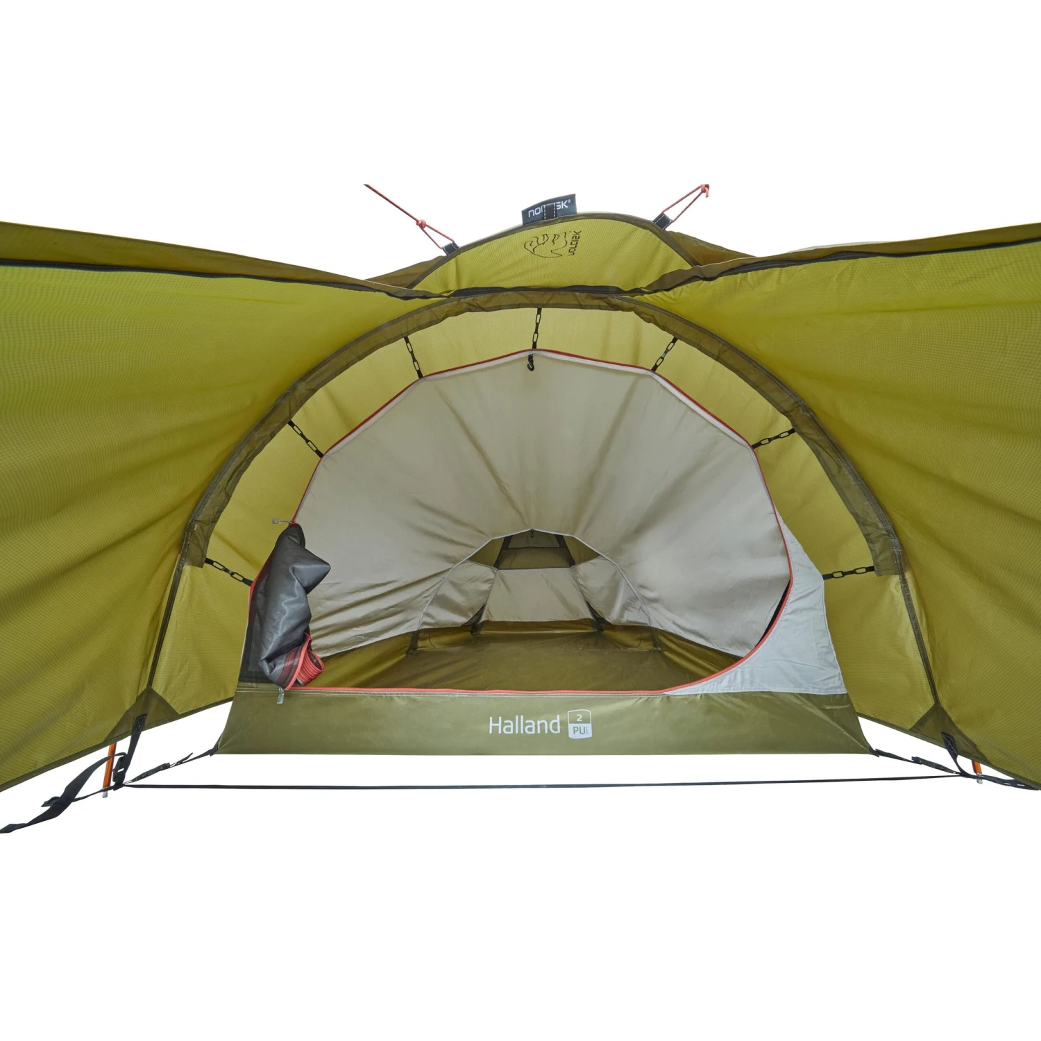 De Nordisk Halland 2 PU lichtgewicht tunneltent is ideaal voor bijvoorbeeld fietskampeerders en motorkampeerders die compact op pad willen. De tent weegt slechts 3 kg en heeft een pakmaat van 50 centimter lang en een diamater van 15 centimeter. Daarbij zijn ook compressie straps op de draagtas geplaatst. Naast de slaapplaats voor 2 personen is er ook een voorportaal.